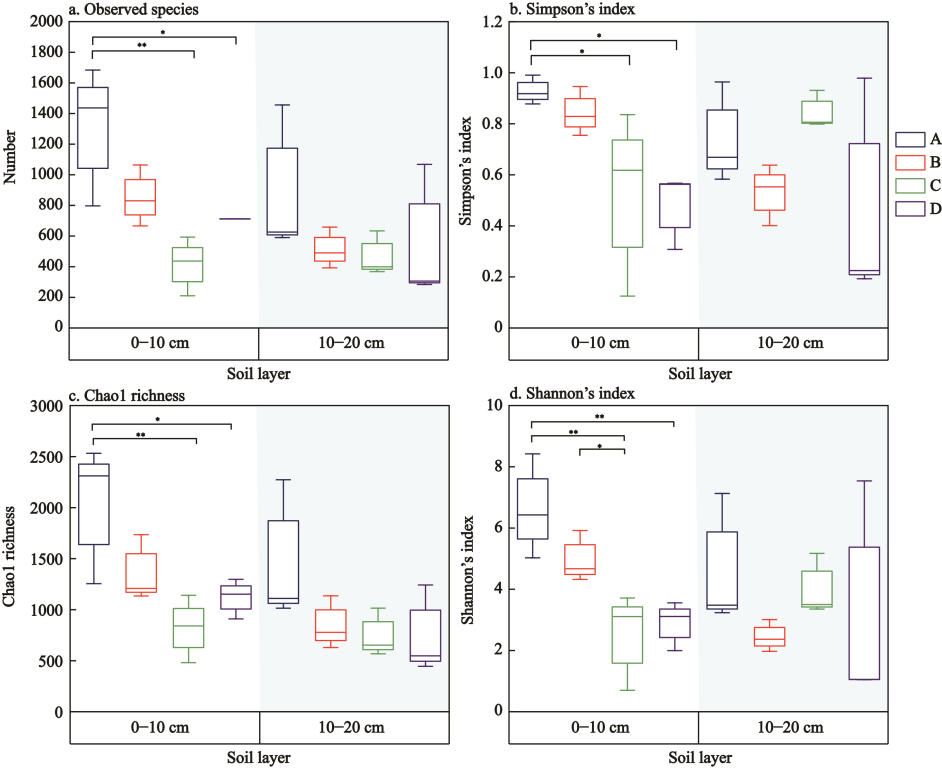 图2 黄河口湿地不同植被群落区真菌α多样性特征