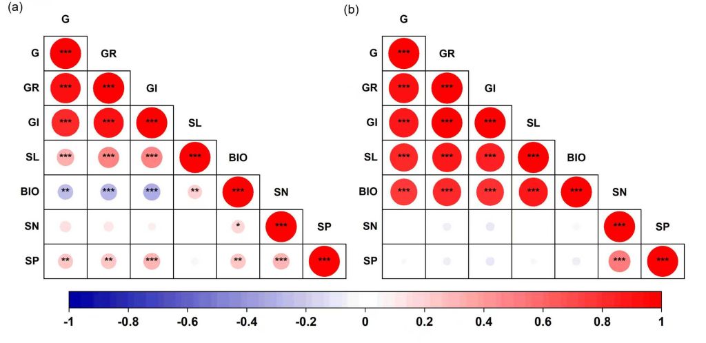 图3盐地碱蓬(a)和芦苇(b)种子萌发性状、早期幼苗生长与种子养分含量的相关性分析