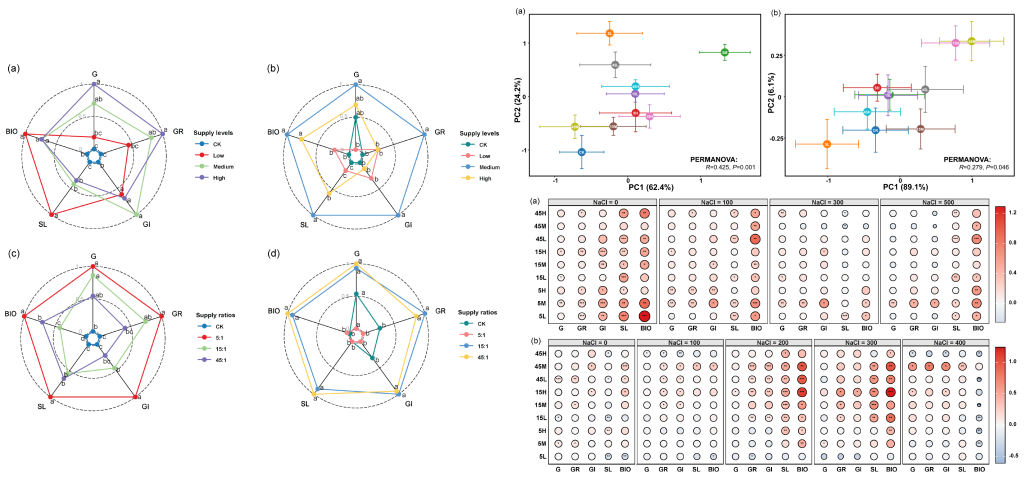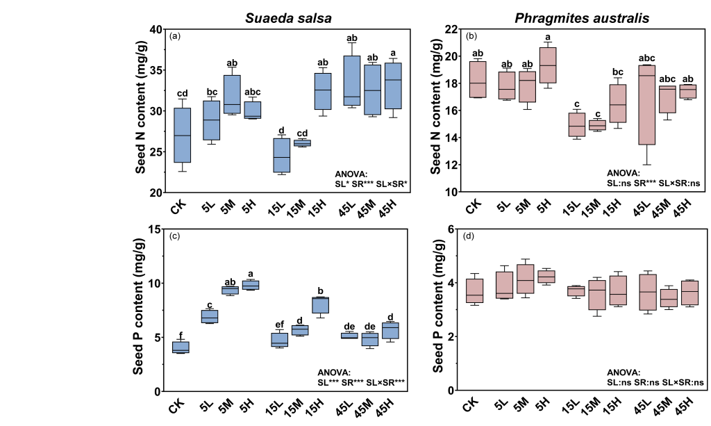 结果表明,长期施肥使盐地碱蓬种子中磷含量显著增加了 17.1%~146.0%,而氮含量变化不大。相比之下,芦苇种子的氮磷含量在不同处理下保持相对稳定。两物种种子的萌发和早期幼苗生长对各种施肥处理的响应不同。盐地碱蓬种子对长期施肥表现出较高的敏感性,在高养分水平或 5:1 供给比下萌发和早期幼苗生长表现最佳。相反,芦苇种子在中等养分水平或更高的氮磷比(15:1 或 45:1)下表现更好。相关性分析表明,盐地碱蓬种子中 P 含量与发芽率、发芽速率、发芽指数和早期幼苗生物量呈显著正相关,而 N 含量仅与生物量呈显著相关。而芦苇种子的氮磷含量与萌发或早期幼苗生长之间无显著相关性。这些发现揭示了不同物种在长期养分富集环境下所采取的特异性响应策略差异,并可能最终影响物种共存、群落演替和滨海湿地在持续全球变化下的恢复力。
