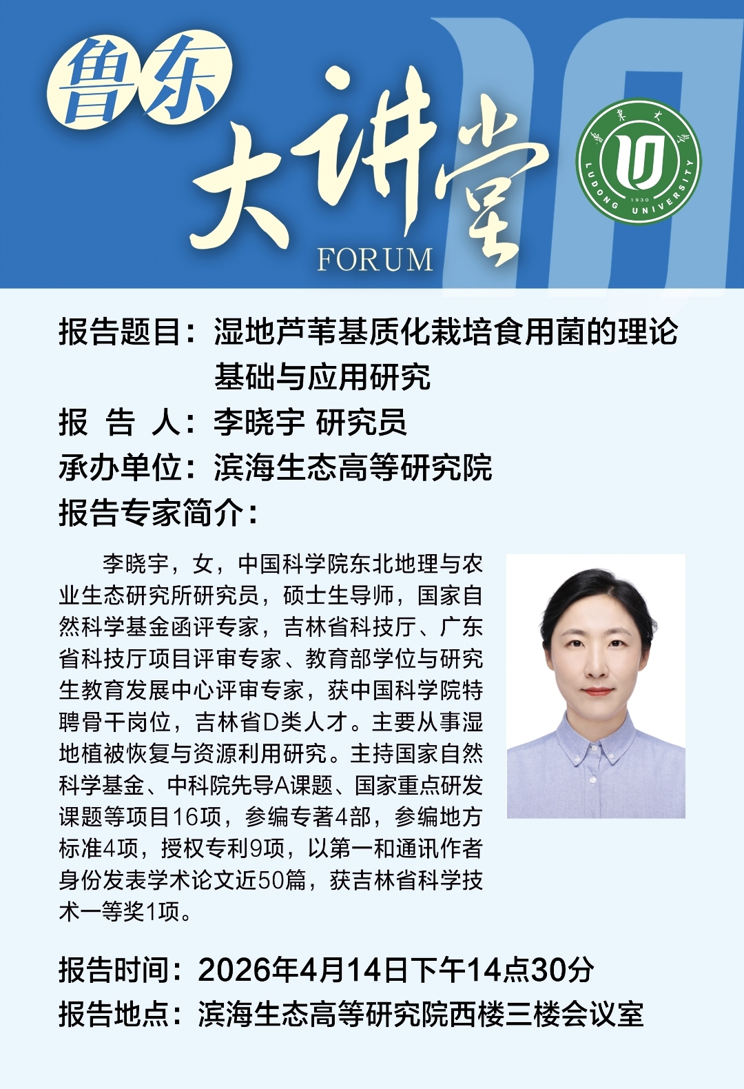 我院诚邀李晓宇研究员于2026年4月14日14:30做湿地芦苇基质化栽培食用菌的理论基础与应用研究报告,请感兴趣的老师、同学参加!