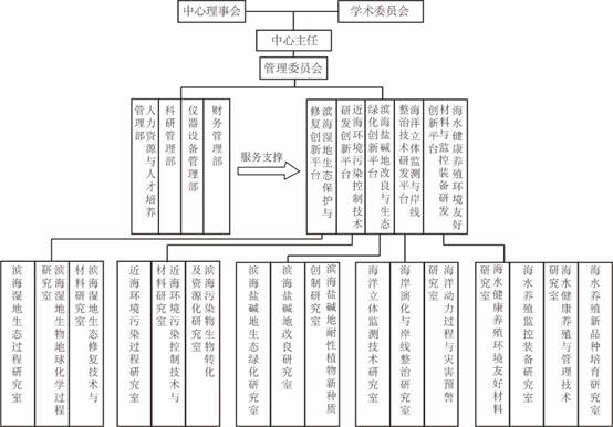 山东省滨海生态环境保护与修复协同创新中心是鲁东大学协同中国科学院生态环境研究中心、北京林业大学、山东省海洋资源与环境研究院、烟台开发区天源水产有限公司、中国科学院遗传与发育生物学研究所6家单位共同组建。中心本着“生态优先,发展绿色环保产业;以生态修复技术为支撑,推动环境保护技术研发的创新驱动”的原则,立足近海生态保护、发展海洋经济,服务于区域建设。中心共搭建5个创新平台,下设16个研究室。